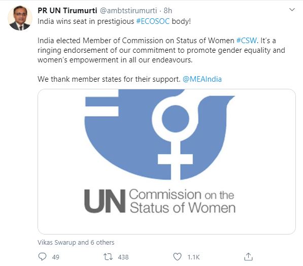 टीएस तिरुमूर्ति ने ट्वीट में कहा, “भारत ने प्रतिष्ठित ECOSOC के निकाय में सीट जीत ली है! भारत को कमीशन ऑन स्टेटस ऑफ वुमेन (सीएसडब्ल्यू) का सदस्य चुना गया है। यह स्त्री-पुरुष समानता और महिला सशक्तीकरण को बढ़ावा देने की हमारे प्रतिबद्धता को दर्शाता है। हम सदस्यों देशों का समर्थन के लिए धन्यवाद करते हैं।”